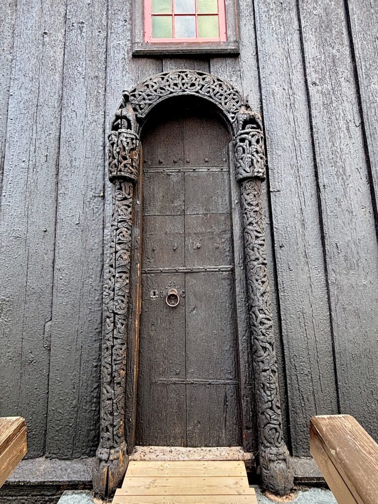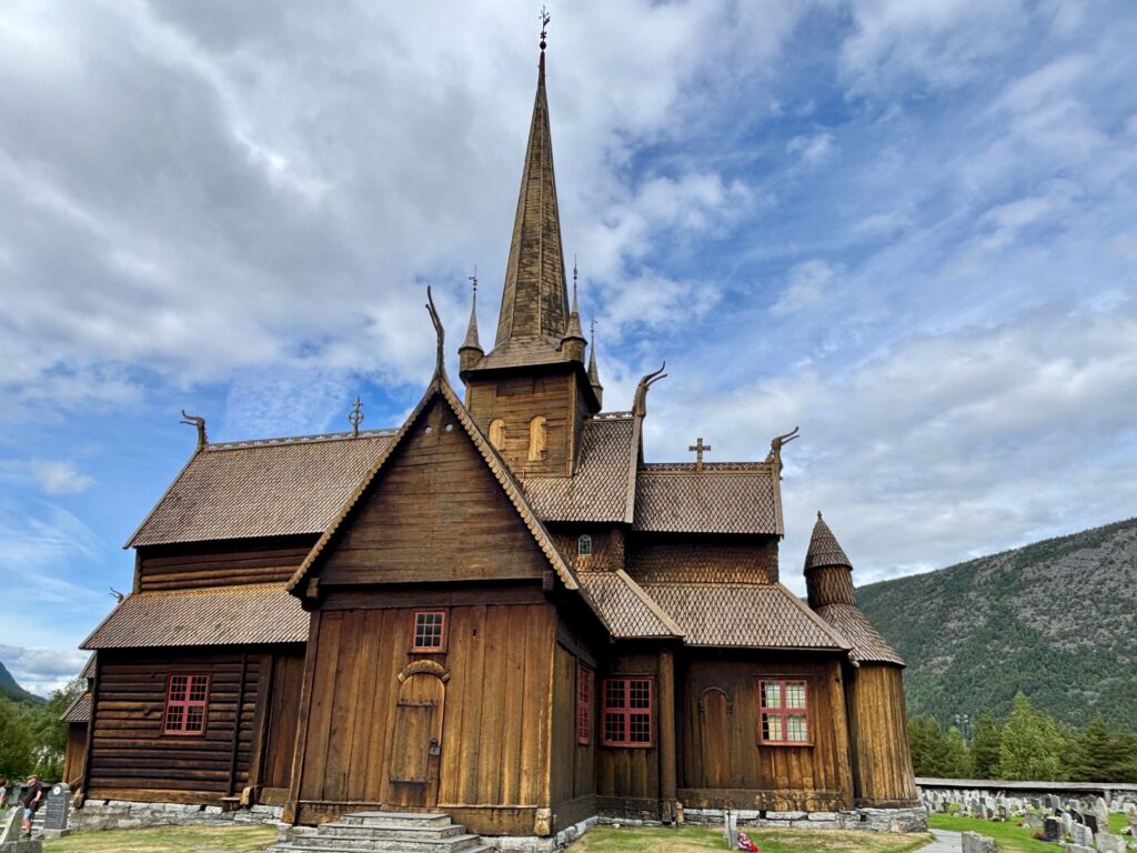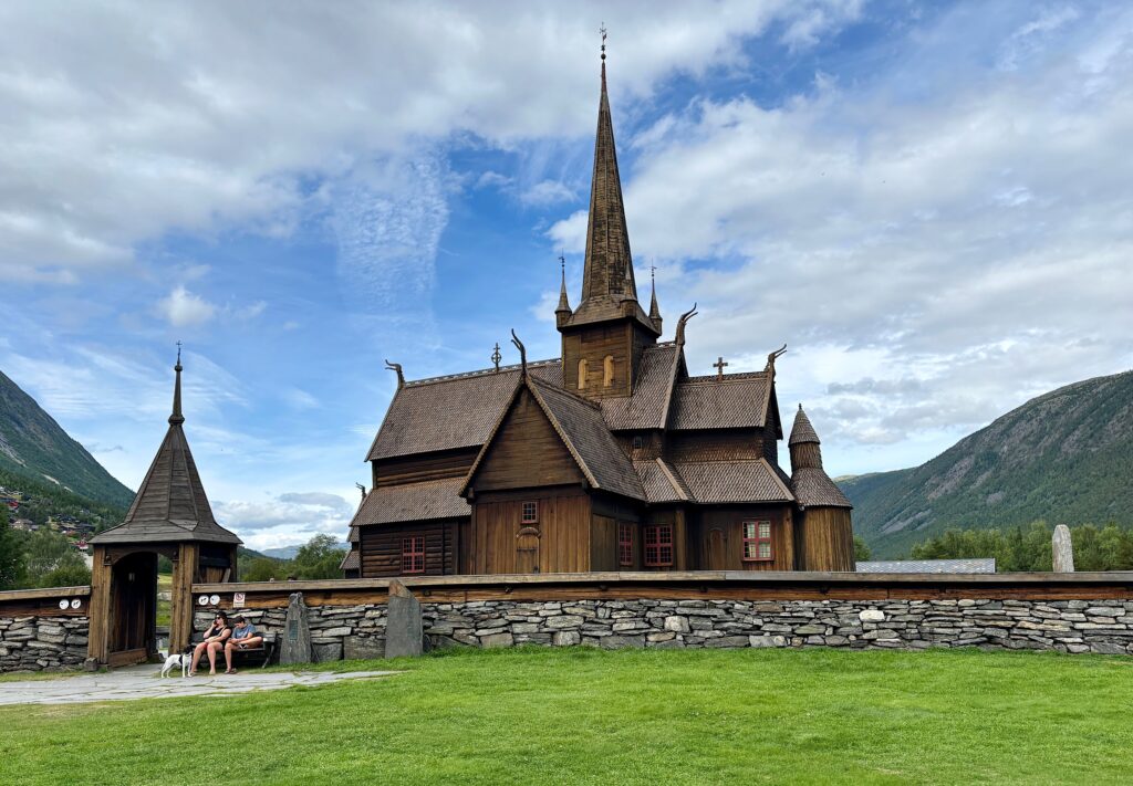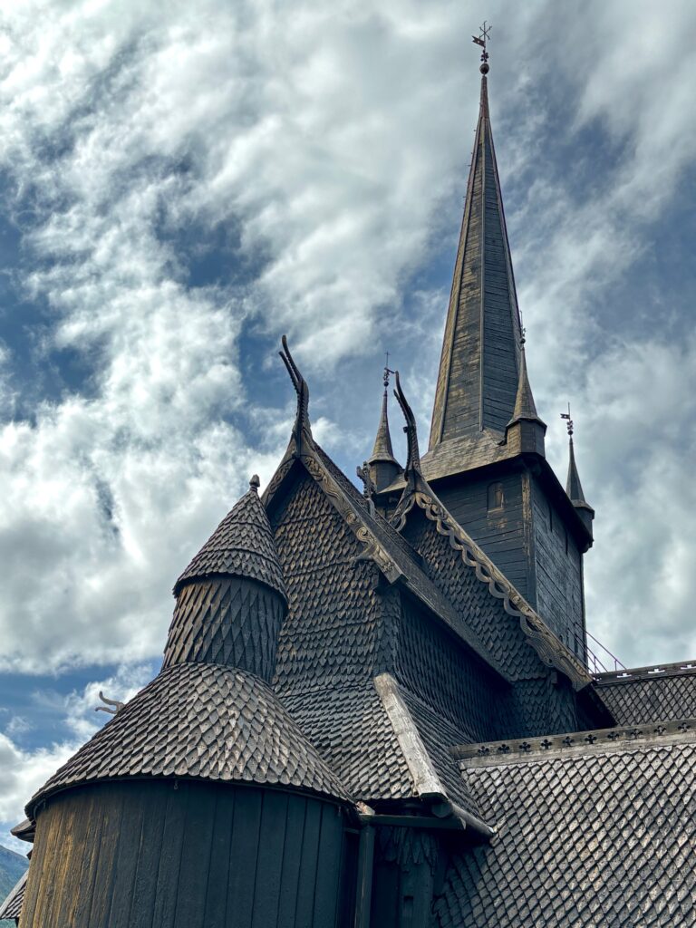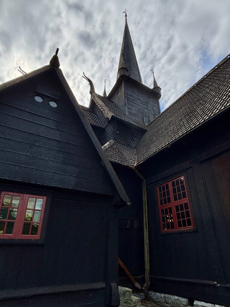 À peine 2 heures plus tard nous arrivons à Fossebergom où se trouve la stavkirke de Lom, une magnifique et grande église en bois debout. Elle a été construite vers 1170. Comme toutes les églises en bois debout, sa façade nord est beaucoup plus foncée que les autres car le goudron de protection qui recouvre le bois y fond moins. Elle est vraiment très belle avec ses têtes de dragons stylisées et ses ornements végétaux.