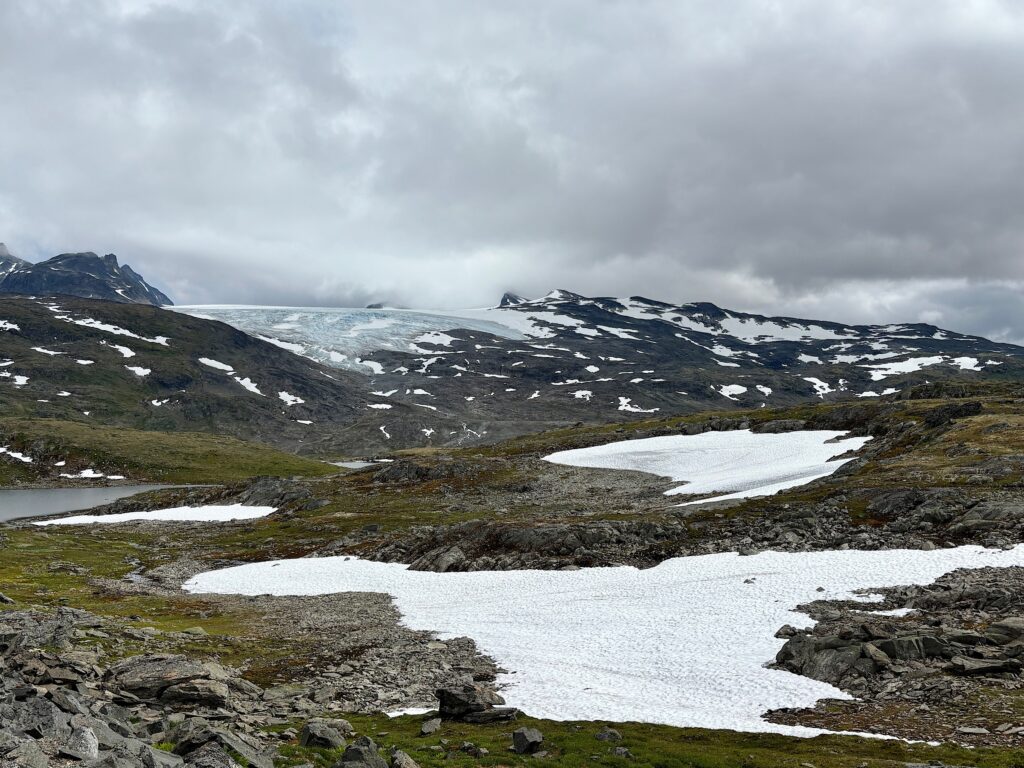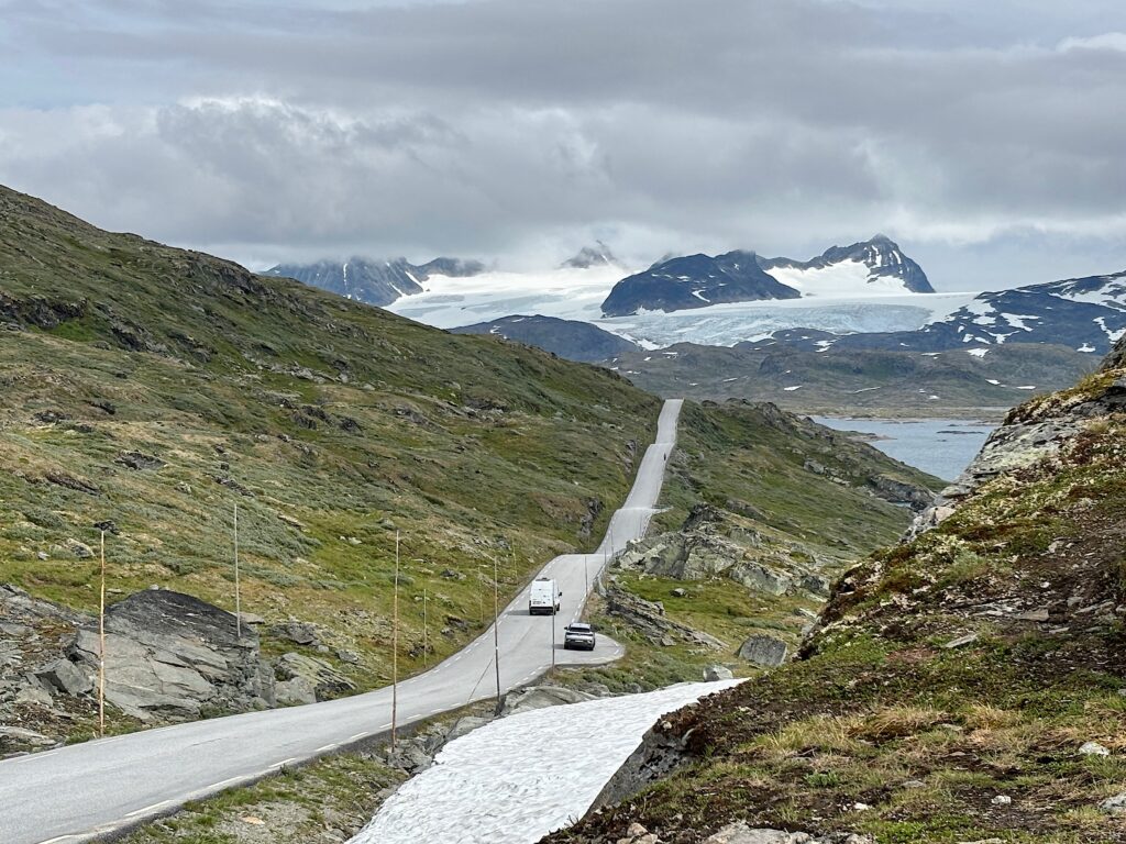 Cette route touristique nationale est la plus élevée de Norvège, culminant à près de 1400 mètres. La température chute à 11°, la neige et les glaciers apparaissent. On traverse le parc national de Jotunheimen où tous les sommets dépassent les 2300 mètres. Les sommets sont dans les nuages et les photos ne restituent pas la grandeur des paysages.