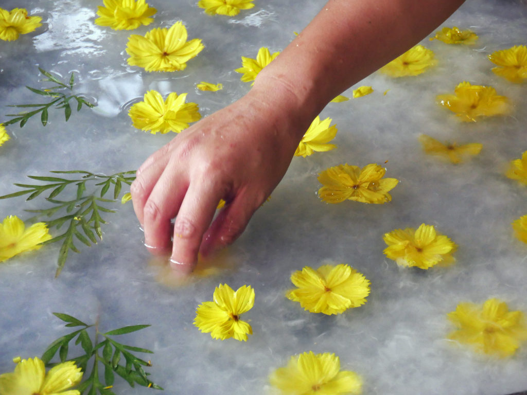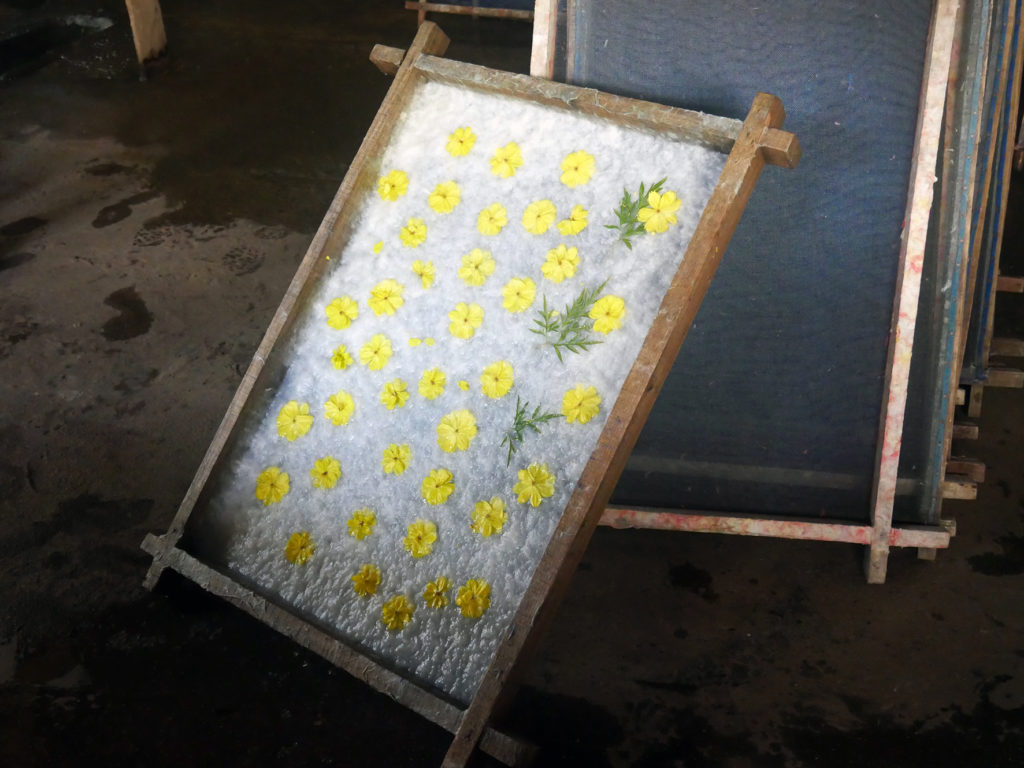 Fatigués, nous prenons la route pour Ban Ou, village d’artisans d’art, mais c’est jour férié pour les bouddhistes et donc ils ne travaillent pas ! Nous ne verrons donc pas les femmes tisser ni les hommes sculpter le bois. Seule une dame accepte de nous montrer la fabrication artisanale de papier de mûrier décoré. Les branches de mûrier sont cueillies dans la forêt, puis on en recueille le cœur qui macéré dans de l’eau devient de la pâte à papier. Décoré de fleurs et feuillages, le papier sert à fabriquer des carnets, lampes, etc.