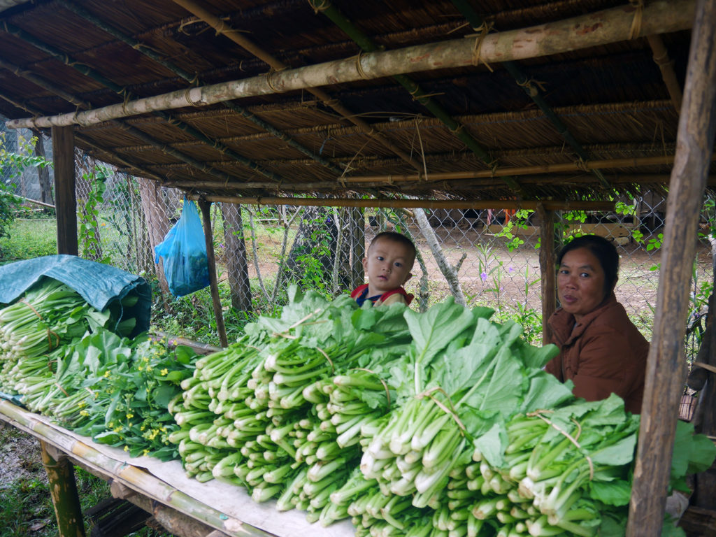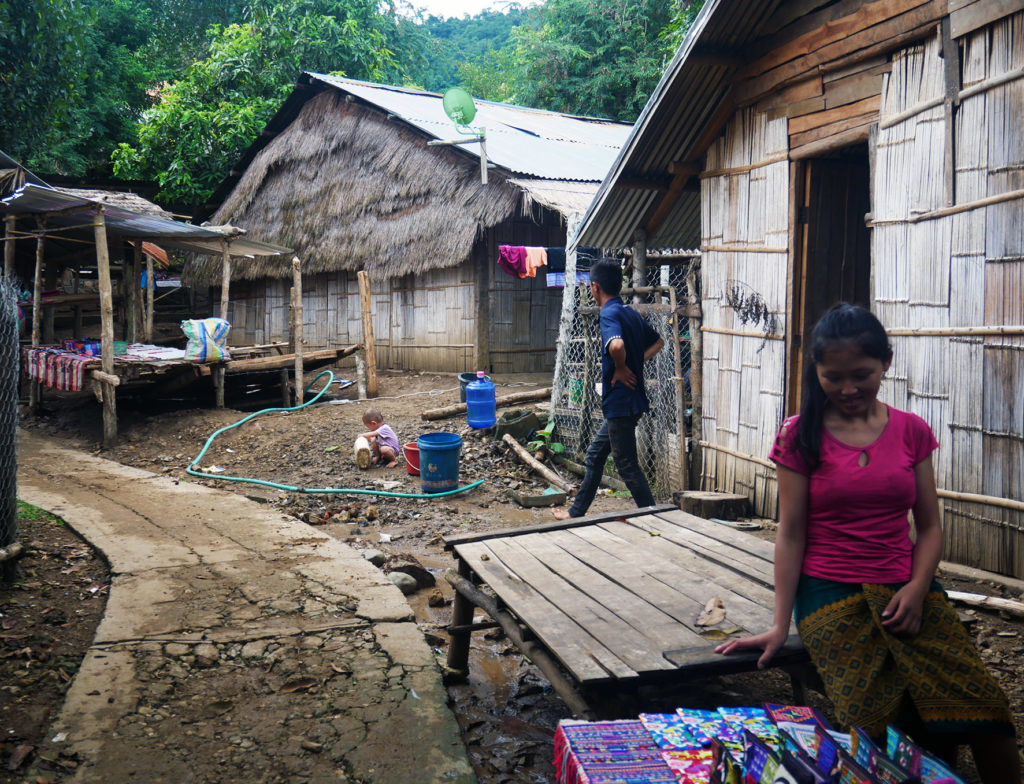 Un peu plus loin, on s’arrête dans un village Hmong qui vit de la vente d’artisanat et notamment de tissage. La pluie de la nuit a détrempé le sol et le passage des scooters a creusé de profonds sillons dans les ruelles en terre. Je n’imagine même pas l’état du village en période de mousson !