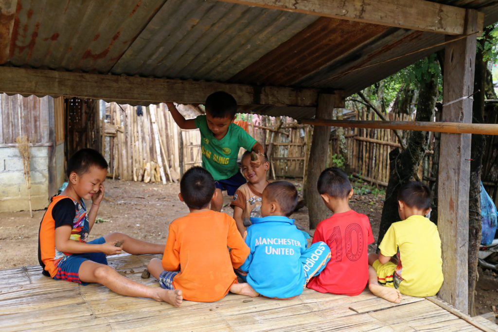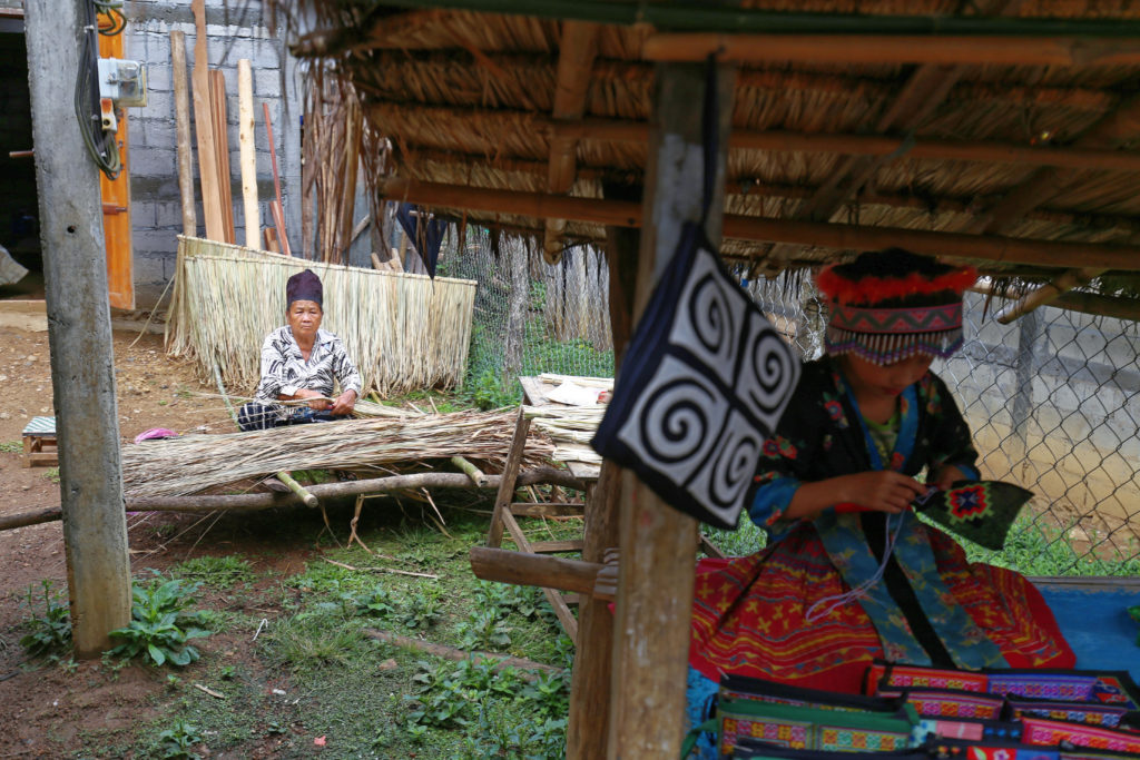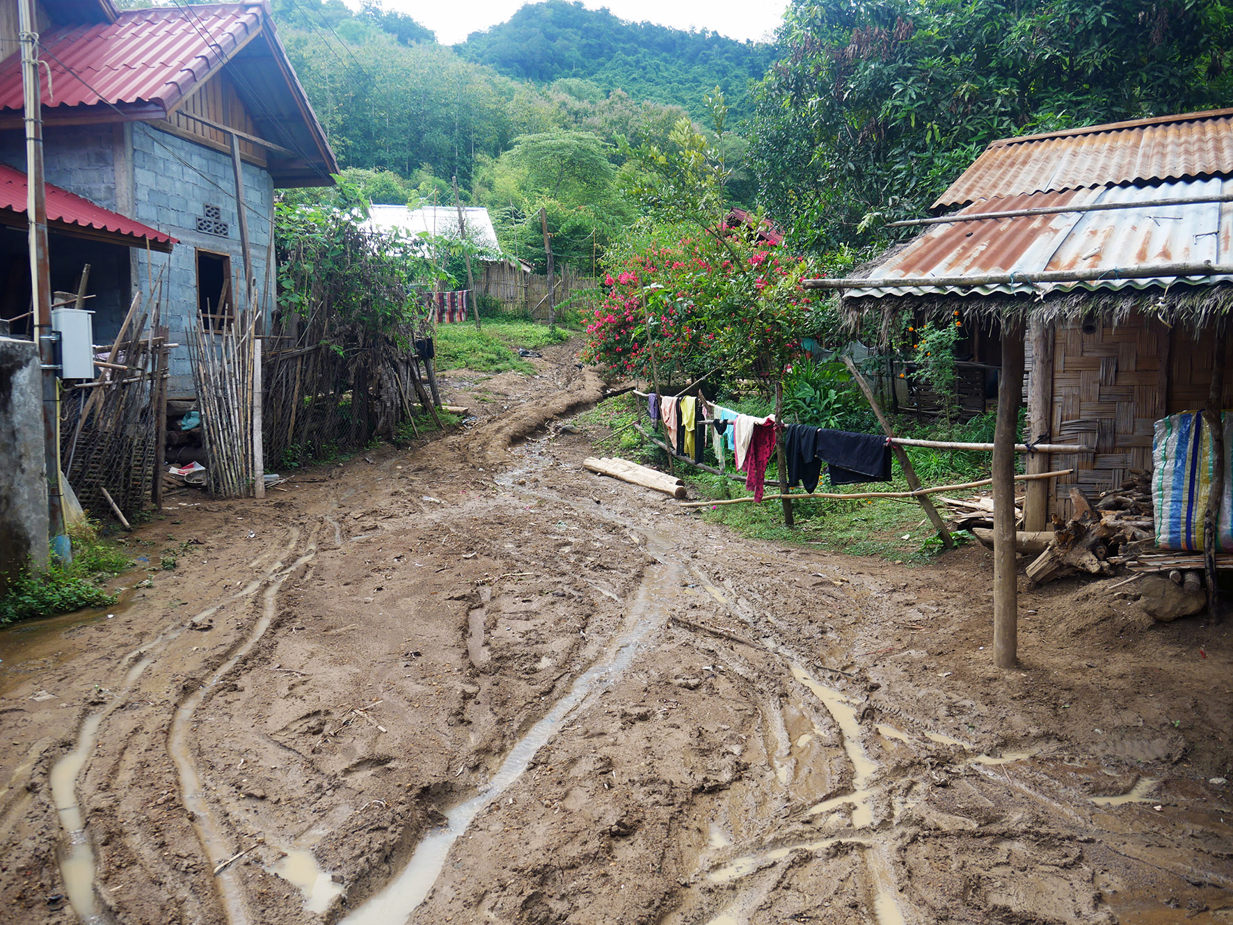 Un peu plus loin, on s’arrête dans un village Hmong qui vit de la vente d’artisanat et notamment de tissage. La pluie de la nuit a détrempé le sol et le passage des scooters a creusé de profonds sillons dans les ruelles en terre. Je n’imagine même pas l’état du village en période de mousson !