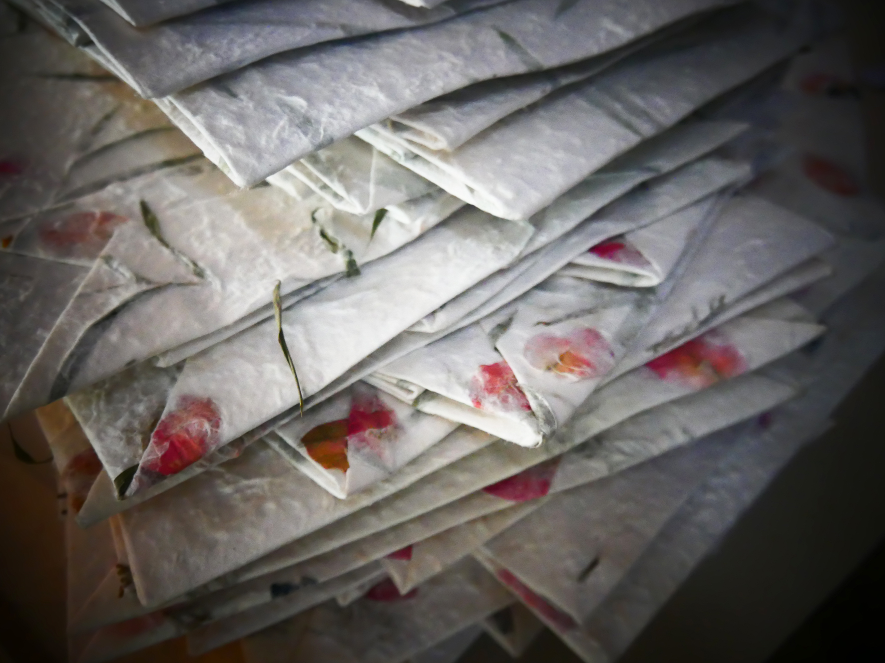 Fatigués, nous prenons la route pour Ban Ou, village d’artisans d’art, mais c’est jour férié pour les bouddhistes et donc ils ne travaillent pas ! Nous ne verrons donc pas les femmes tisser ni les hommes sculpter le bois. Seule une dame accepte de nous montrer la fabrication artisanale de papier de mûrier décoré. Les branches de mûrier sont cueillies dans la forêt, puis on en recueille le cœur qui macéré dans de l’eau devient de la pâte à papier. Décoré de fleurs et feuillages, le papier sert à fabriquer des carnets, lampes, etc.