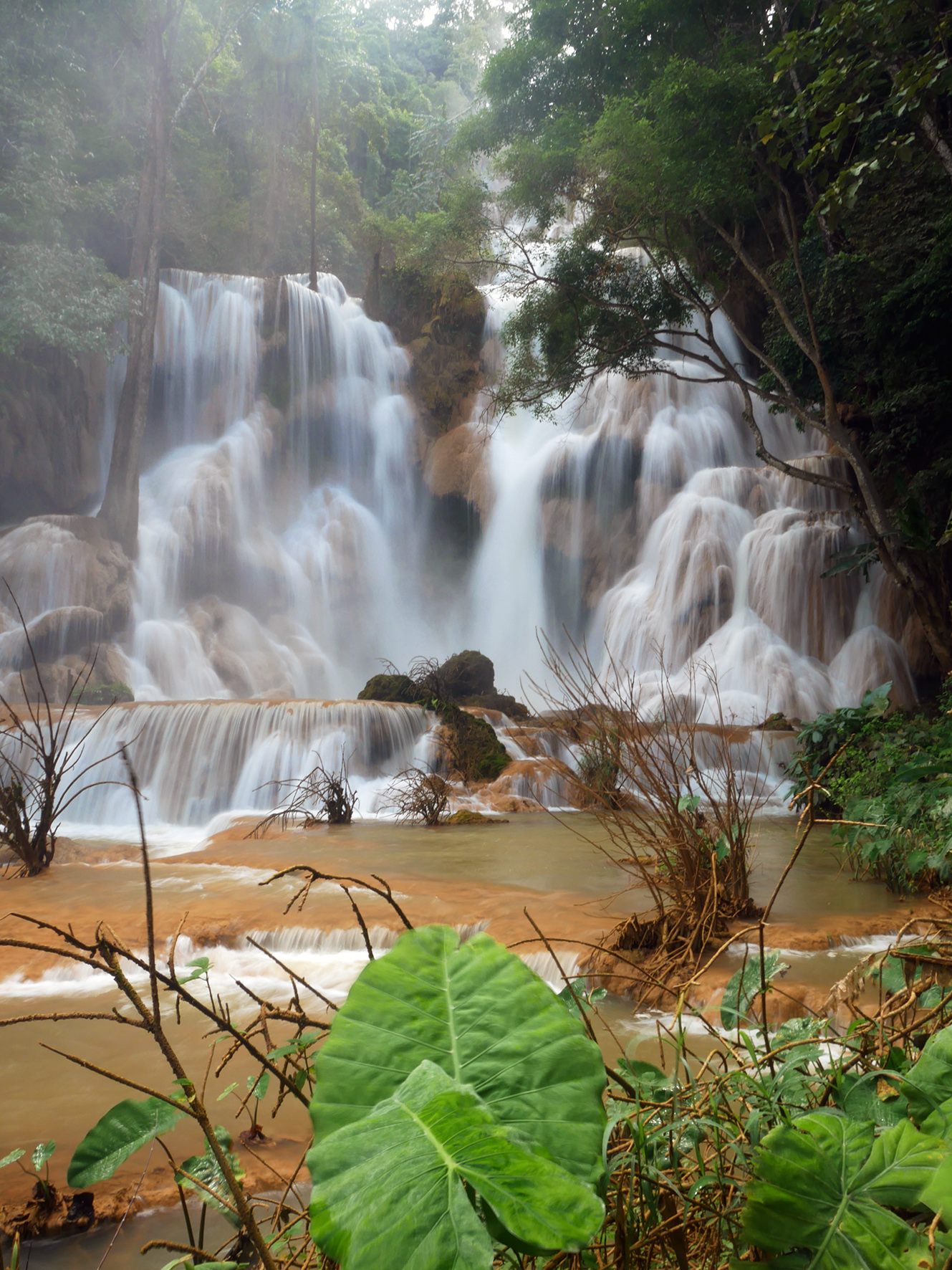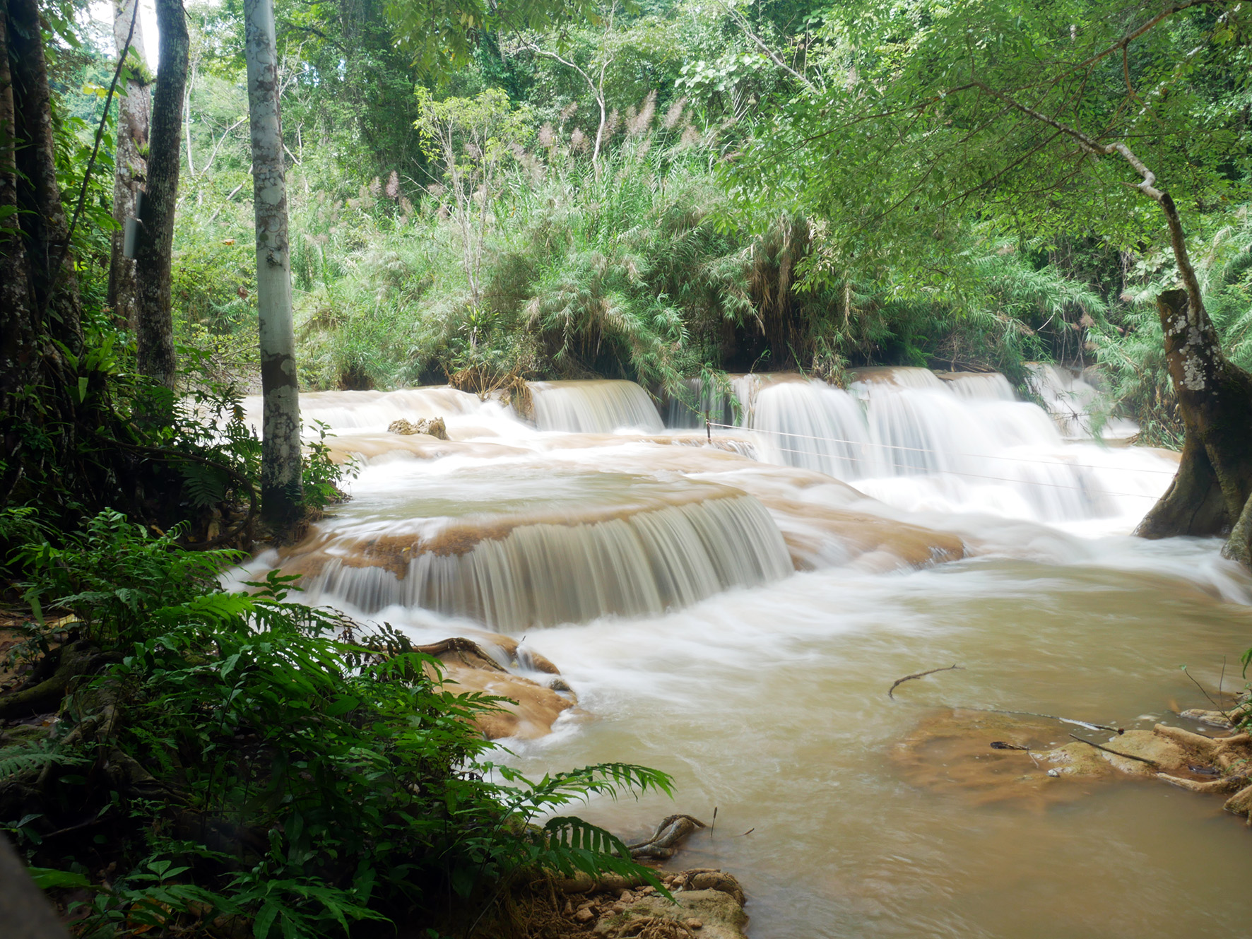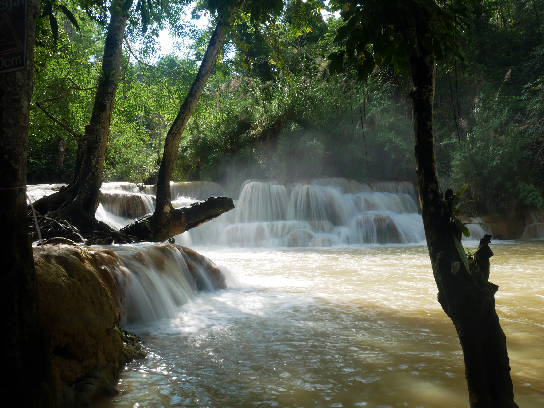 A 30km de Luang Prabang, on arrive au site des chutes de Kouang Si. Le chemin pour y accéder est un peu boueux mais praticable. On déjeune au pied des cascades, puis on profite du lieu qui est très joli. Le seul problème, c’est qu’avec l’orage de la nuit, l’eau est marron au lieu du bleu turquoise habituel. Pas de chance pour nous ! La couleur et l’opacité de l’eau ne décourage pas les plus téméraires qui plongent dans l’eau froide des piscines naturelles.
