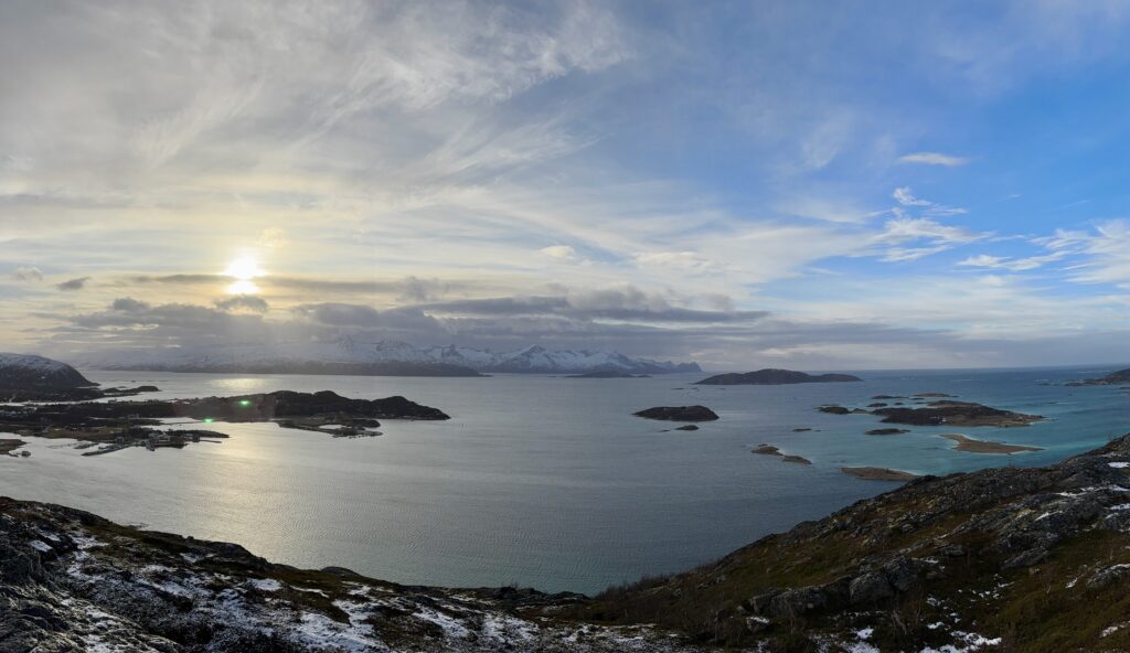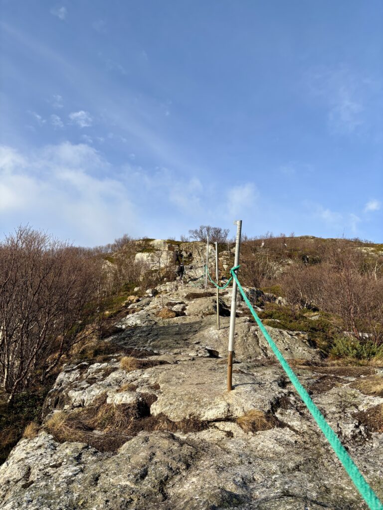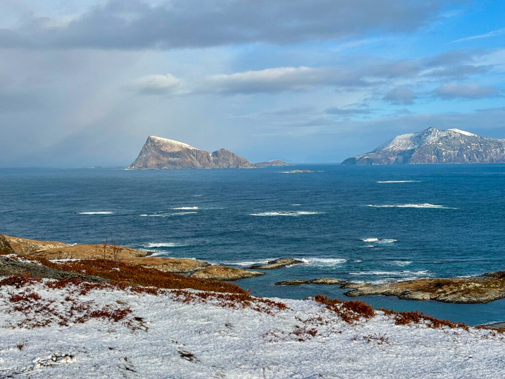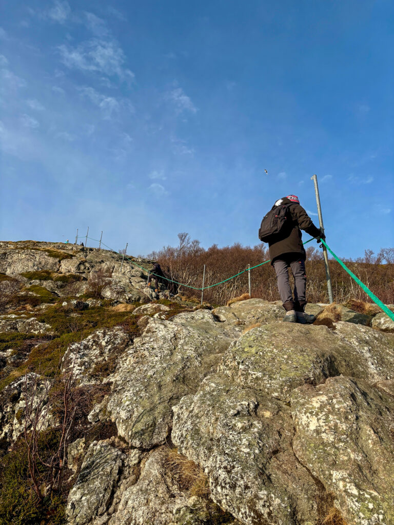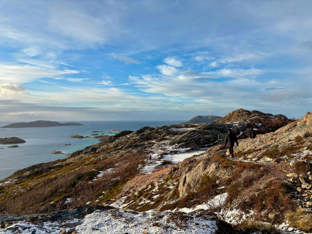 L’avantage d’aller jusqu’au sommet de Trehørningen, c’est qu’on voit des deux côtés de la colline et jusqu’à Skulsfjord. Ca doit valoir le coup d’aller au bout, surtout que nous avions fait le plus dur ; quand on arrive à la vue sur Belvika, il n’y a plus d’arbres, le sol est rocheux donc plus dur et le terrain s’aplanit un peu. Mais nous manquons de temps.