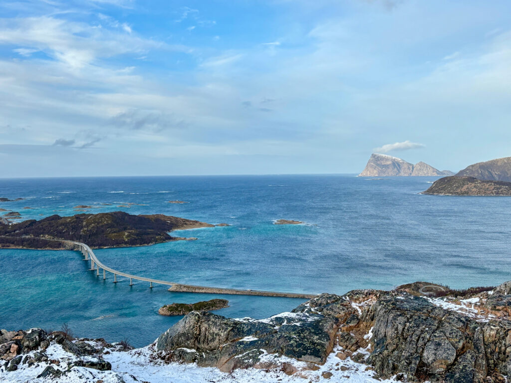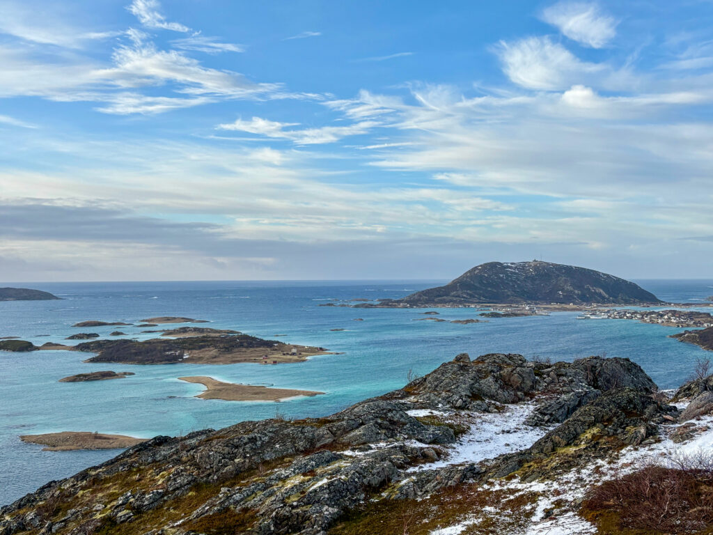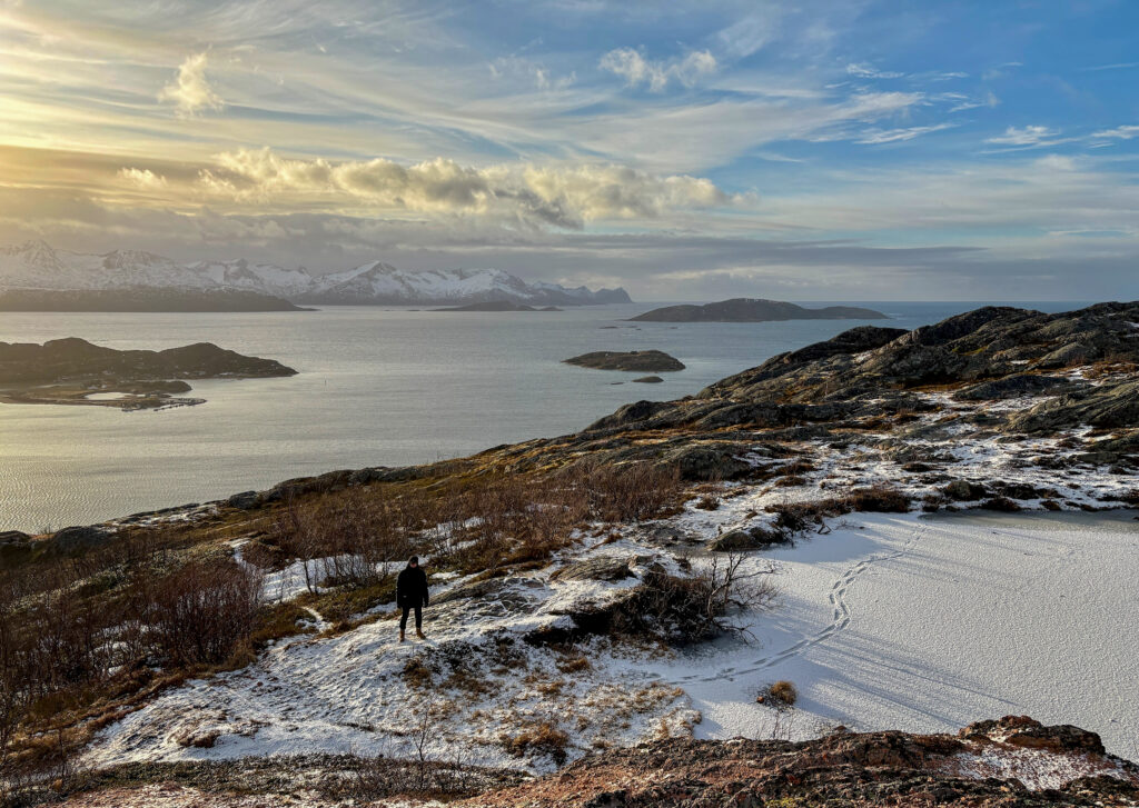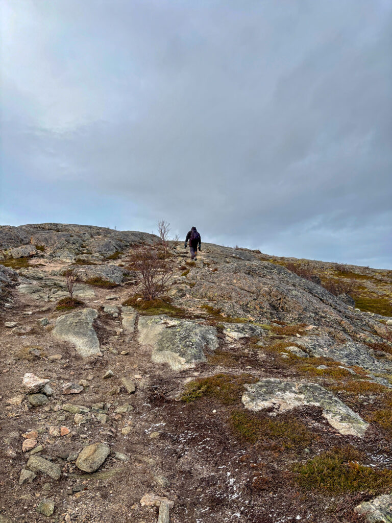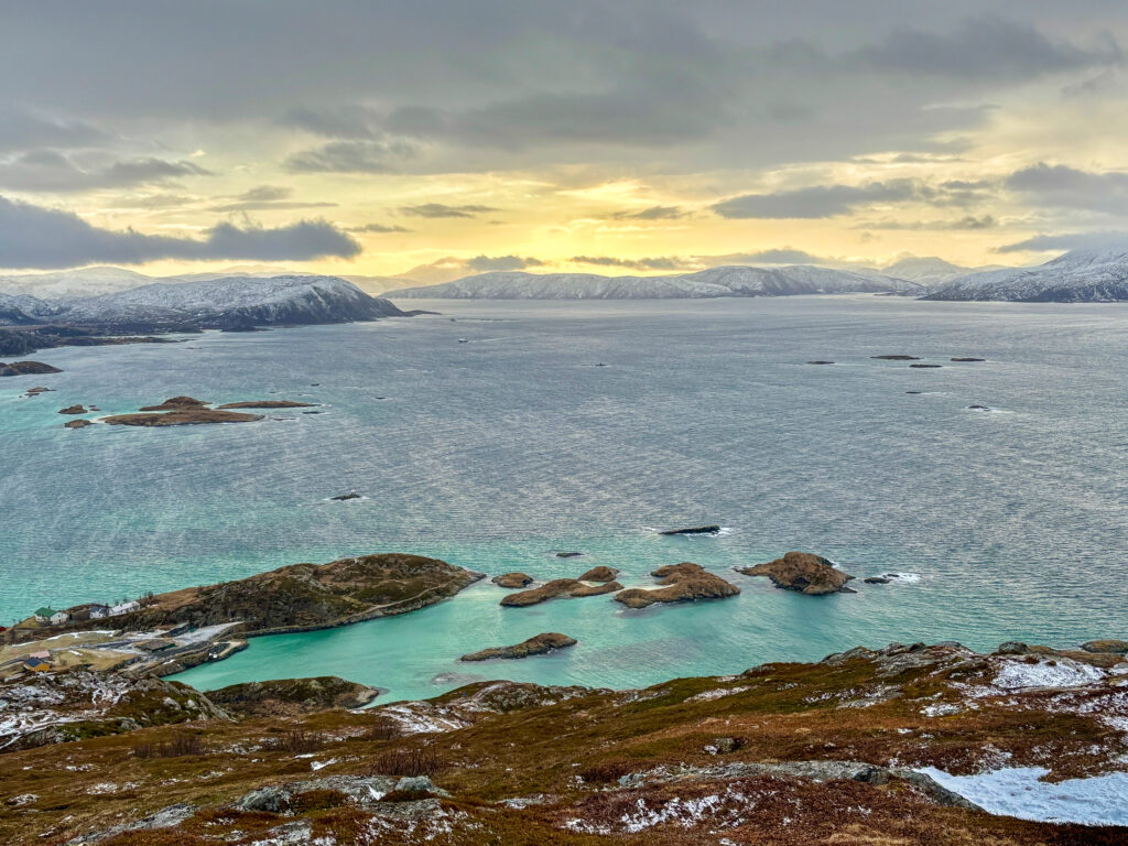 L’avantage d’aller jusqu’au sommet de Trehørningen, c’est qu’on voit des deux côtés de la colline et jusqu’à Skulsfjord. Ca doit valoir le coup d’aller au bout, surtout que nous avions fait le plus dur ; quand on arrive à la vue sur Belvika, il n’y a plus d’arbres, le sol est rocheux donc plus dur et le terrain s’aplanit un peu. Mais nous manquons de temps.
