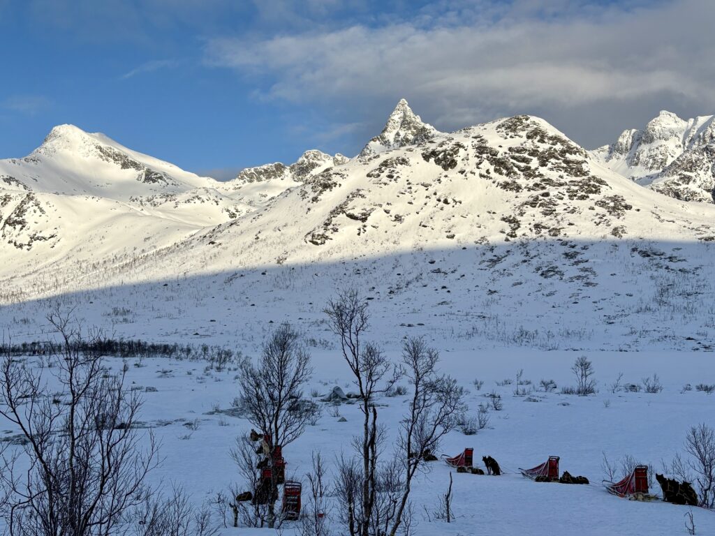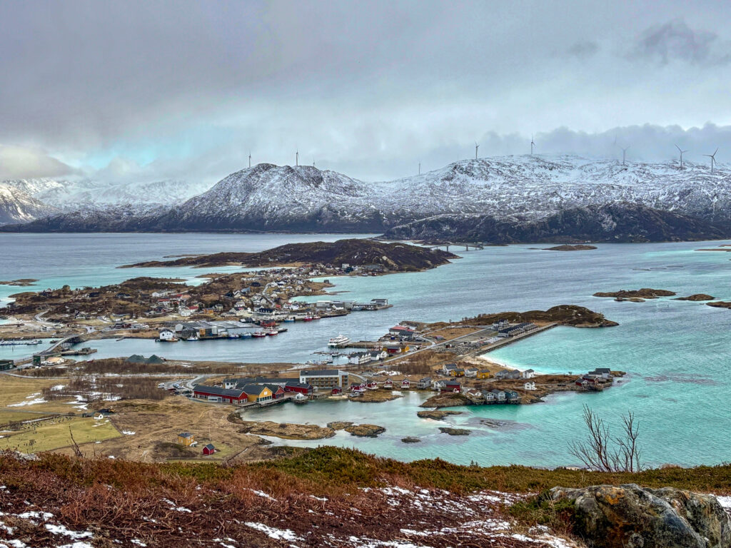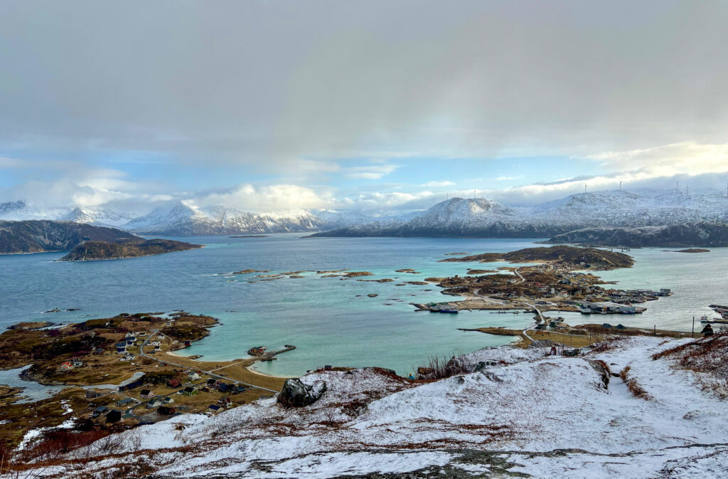 Malgré la neige collante qui s’agglutine sous nos crampons, on parvient au point de vue sur Belvika. On a quand même mis plus de 3/4 d’heure pour monter 800 mètres ! Heureusement que le panorama en vaut la peine ! Avec les quelques centimètres de neige tombés cette nuit, c’est très joli.