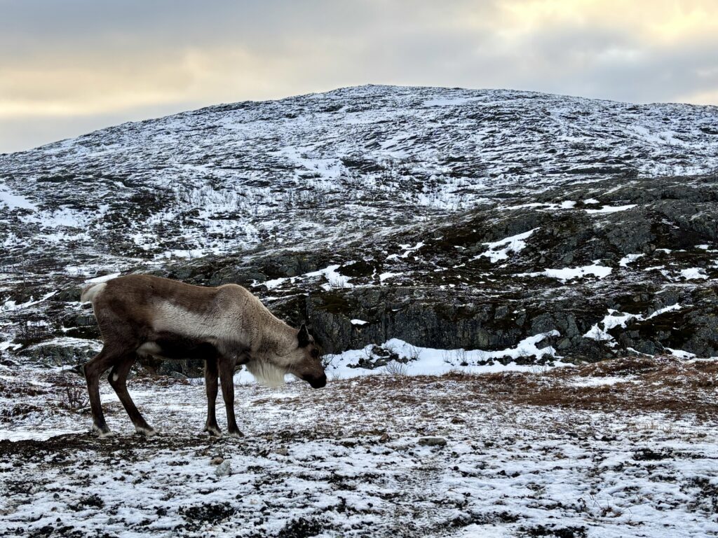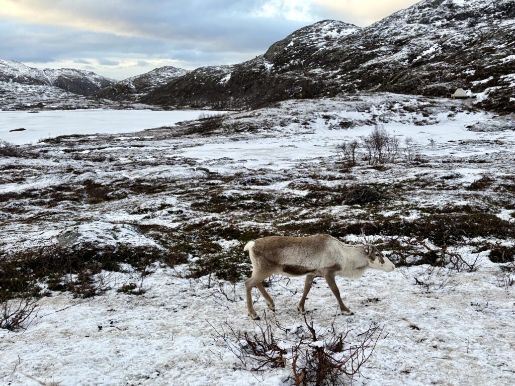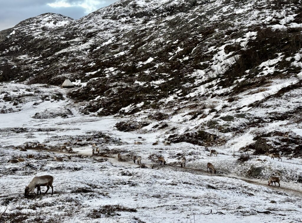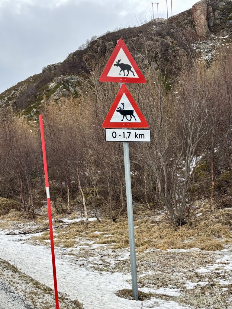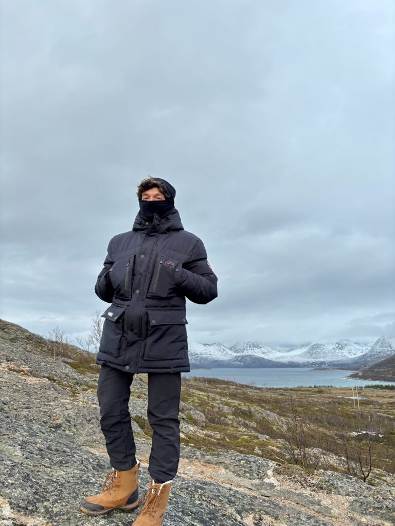 La randonnée qui est prévue ce matin est courte mais intense : 1,5 km aller-retour et 150 mètres de dénivelé. En gros, ça monte tout droit, en pente raide, pour arriver au sommet d’une montagne. Enfin, pour être honnête, on ne l’a pas faite en entier. Nous avons suivi la trace donnée sur AllTrails qui s’appelle « vue de Belvika ». Le départ est au même endroit et c’est le même chemin sauf qu’on s’arrête bien avant le sommet de Trehorningen. Dans des conditions neigeuses, c’est déjà pas mal !