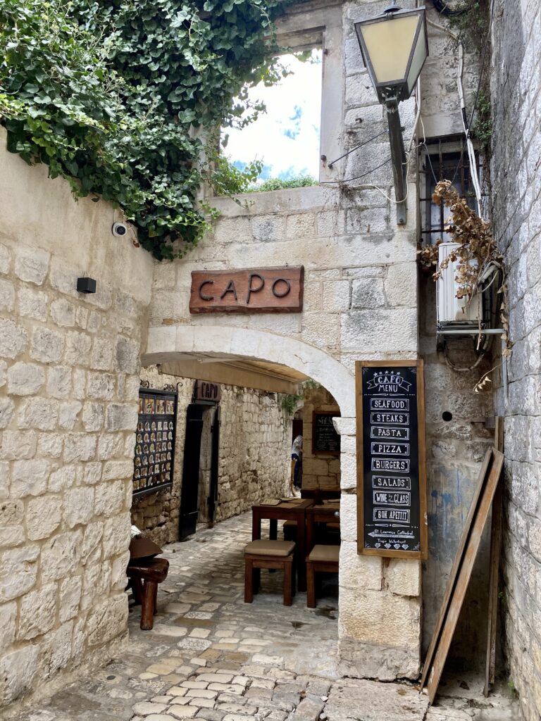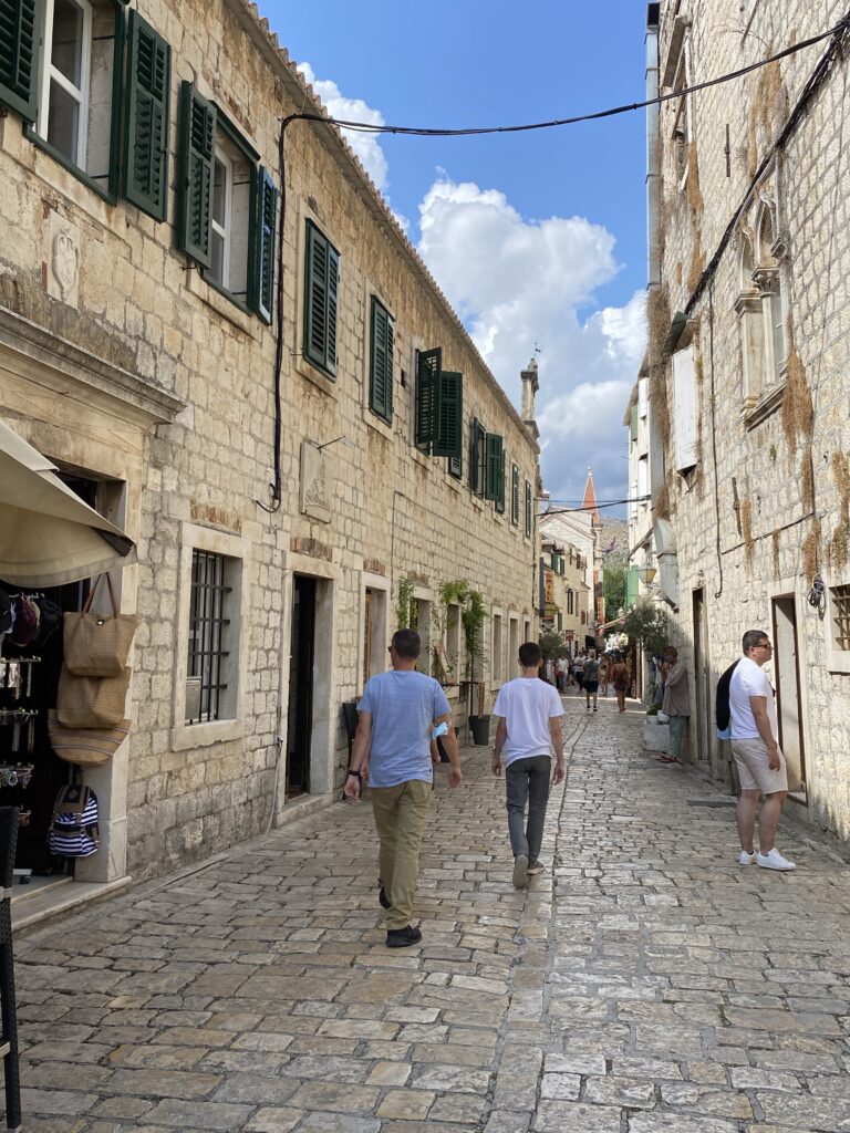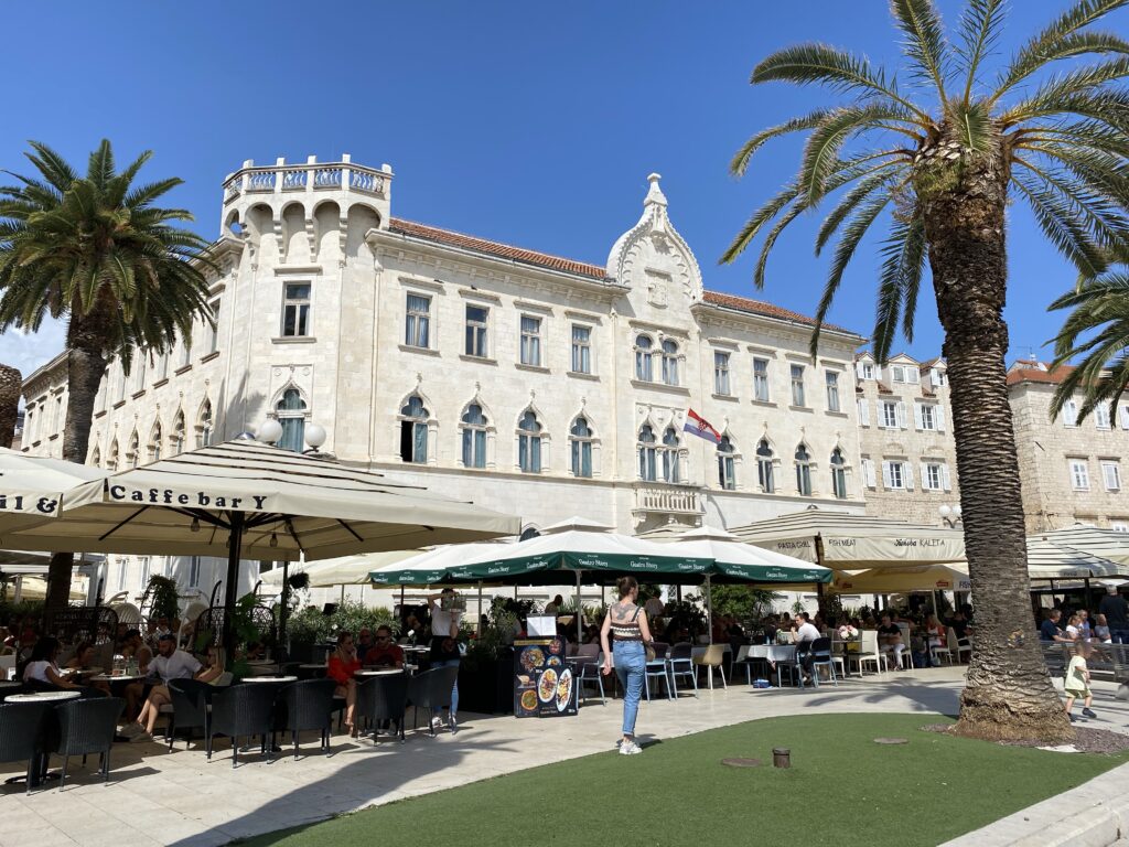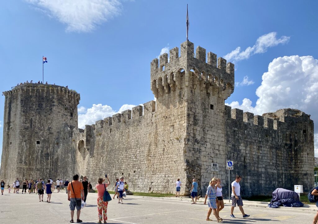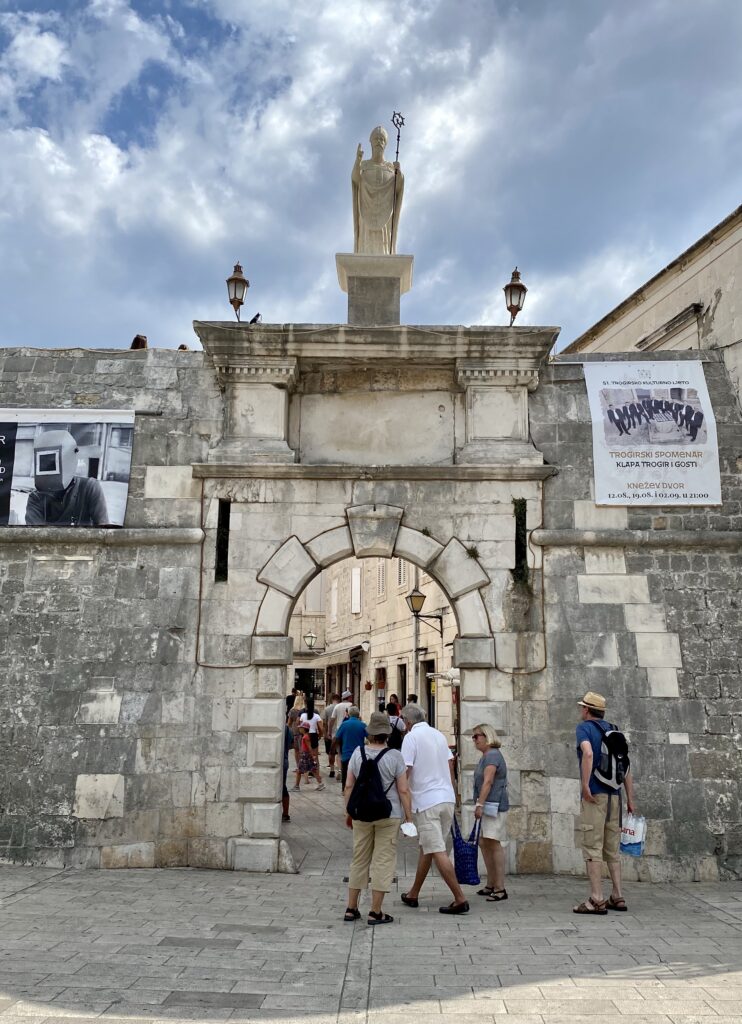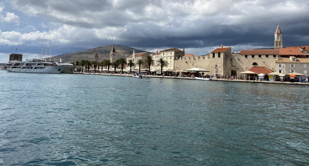 Nous quittons notre douillet chalet de Plitvicka sous un ciel gris et seulement 11°. En roulant vers le sud, les degrés remontent jusqu’à atteindre 25° à Trogir où nous arrivons pour déjeuner.