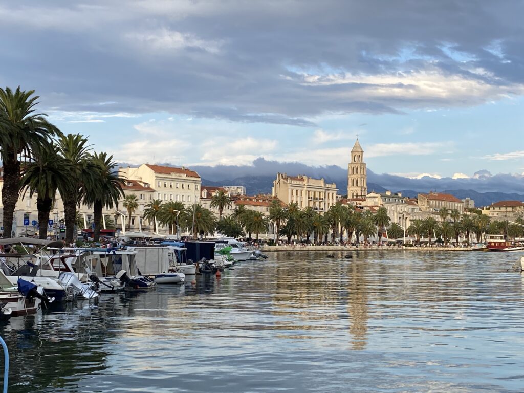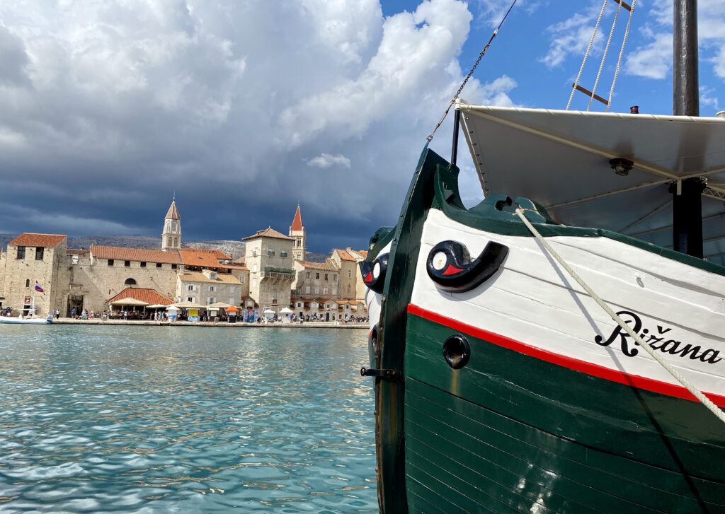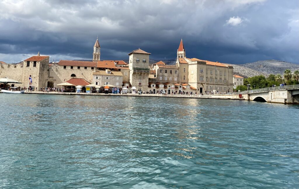 De l’autre côté du pont, on accède à l’île de Ciovo. C’est là qu’on mettait les lépreux lors des épidémies… depuis, les résidences de tourisme ont poussé comme des champignons et maintenant l’île est principalement peuplée de touristes ! D’ici, on a une belle vue dégagée sur la vieille ville de Trogir et sur la promenade du front de mer. Les nuages d’orage au fond font ressortir les couleurs chaudes des pierres.