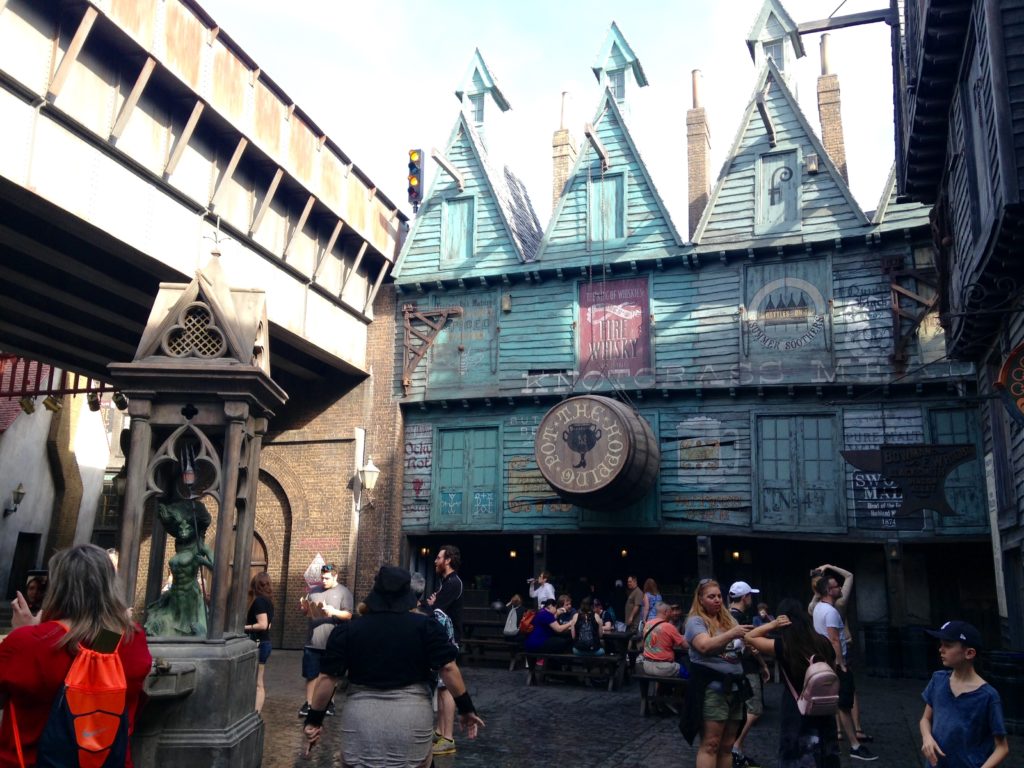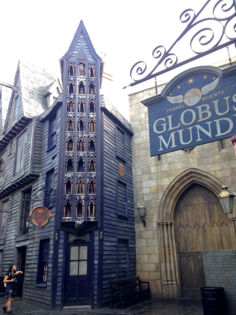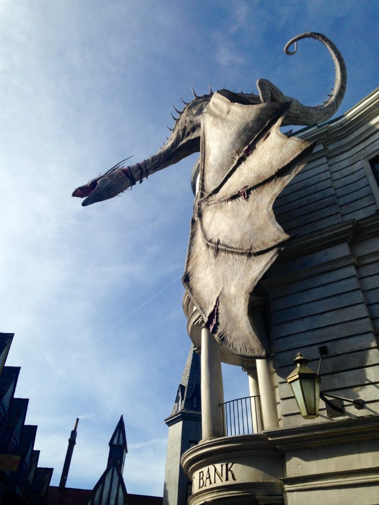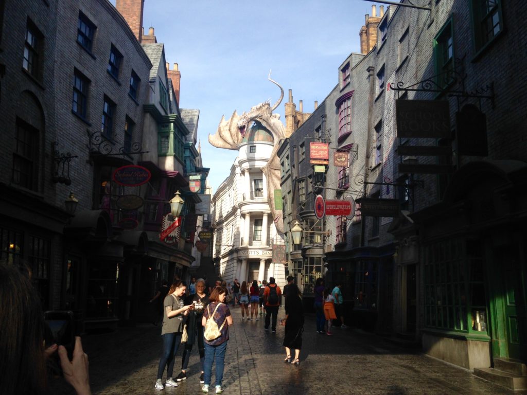 Nous enchaînons avec Escape from Gringotts, l’attraction D’Harry Potter. Encore une fois nous sommes bluffés par les décors et les effets spéciaux. L’attraction est super et le village, où l’on accède par un mur caché, est très très bien réalisé.